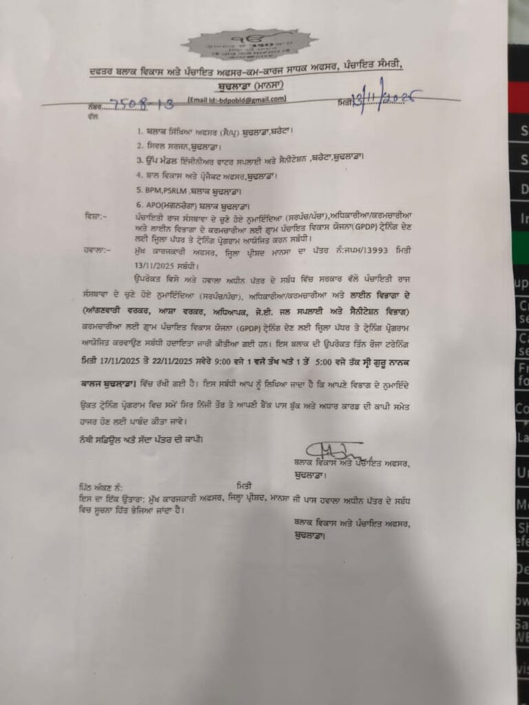 17 ਨਵੰਬਰ, ਮਾਨਸਾ:-ਮੁੱਖ ਮੰਤਰੀ ਅਤੇ ਸਿੱਖਿਆ ਮੰਤਰੀ ਪੰਜਾਬ ਵੱਲੋਂ ਵੱਖ-ਵੱਖ ਮੰਚਾਂ ਤੋਂ ਅਧਿਆਪਕਾਂ ਨੂੰ ਗ਼ੈਰ ਵਿਦਿਅਕ ਕੰਮਾਂ ਤੋਂ ਦੂਰ ਰੱਖਣ ਦੇ ਸਰਕਾਰੀ ਦਾਅਵਿਆਂ ਦੇ ਬਾਵਜੂਦ ਪੰਜਾਬ ਦੇ ਅਧਿਆਪਕਾਂ ਦੀਆਂ ਅਜਿਹੀਆਂ ਡਿਊਟੀਆਂ ਲੱਗਣੀਆਂ ਜਾਰੀ ਹਨ। ਪੰਚਾਇਤੀ ਰਾਜ ਮੰਤਰਾਲਾ ਭਾਰਤ ਸਰਕਾਰ ਦੇ ਨਿਰਦੇਸ਼ਾਂ ‘ਤੇ ਪੰਚਾਇਤੀ ਰਾਜ ਸੰਸਥਾਵਾਂ ਦੇ ਚੁਣੇ ਹੋਏ ਨੁਮਾਇੰਦਿਆਂ, ਅਧਿਕਾਰੀਆਂ ਅਤੇ ਕਰਮਚਾਰੀਆਂ ਦੀਆਂ ਲਗਾਈਆਂ ਜਾ ਰਹੀਆਂ ਤਿੰਨ ਦਿਨਾਂ ਟ੍ਰੇਨਿੰਗਾਂ ਦਾ ਹਿੱਸਾ ਬਣਨ ਲਈ ਮਾਨਸਾ ਜਿਲ੍ਹੇ ਦੇ ਸੈਕੜੇ ਪ੍ਰਾਇਮਰੀ ਅਧਿਆਪਕਾਂ ਨੂੰ ਵੀ ਸਕੂਲਾਂ ਤੋਂ ਬਾਹਰ ਸੱਦਿਆ ਗਿਆ ਹੈ। ਅਧਿਆਪਕ ਜਥੇਬੰਦੀ ਡੈਮੋਕ੍ਰੈਟਿਕ ਟੀਚਰਜ਼ ਫ਼ਰੰਟ (ਡੀ.ਟੀ.ਐੱਫ.) ਨੇ ਇਸ ਫੈਸਲੇ ਦੀ ਸਖ਼ਤ ਨਿਖੇਧੀ ਕਰਦੇ ਹੋਏ ਪੰਜਾਬ ਸਰਕਾਰ ਤੋਂ ਇਹਨਾਂ ਟ੍ਰੇਨਿੰਗਾਂ ਵਿੱਚ ਸਰਕਾਰੀ ਪ੍ਰਾਇਮਰੀ ਸਕੂਲਾਂ ਦੇ ਅਧਿਆਪਕਾਂ ਨੂੰ ਹਿੱਸਾ ਬਣਾਉਣ ‘ਤੇ ਰੋਕ ਲਗਾਉਣ ਅਤੇ ਸਕੂਲਾਂ ਦੇ ਵਿਦਿਅਕ ਮਾਹੌਲ਼ ਨੂੰ ਪ੍ਰਭਾਵਿਤ ਕਰਨ ਵਾਲੇ ਫ਼ੈਸਲਿਆਂ ‘ਤੇ ਠੱਲ ਪਾਉਣ ਦੀ ਗੁਹਾਰ ਲਗਾਈ ਹੈ।ਡੀ.ਟੀ.ਐੱਫ. ਮਾਨਸਾ ਦੇ ਜਿਲ੍ਹਾ ਪ੍ਰਧਾਨ ਅਮੋਲਕ ਡੇਲੂਆਣਾ ਅਤੇ ਜਿਲ੍ਹਾ ਸਕੱਤਰ ਹੰਸਾ ਸਿੰਘ ਨੇ ਮੀਡਿਆ ਨੂੰ ਬਿਆਨ ਜਾਰੀ ਕਰਦੇ ਹੋਏ ਦੱਸਿਆ ਕਿ ਇਸ ਤੋਂ ਪਹਿਲਾਂ ਵੀ ਅਧਿਆਪਕਾਂ ਦੀ ਡਿਊਟੀ ਕਦੇ ਪਰਾਲੀ ਸਾੜਨ ਤੋਂ ਰੋਕਣ ਪ੍ਰਤੀ ਜਾਗਰੂਕਤਾ ਪੈਦਾ ਕਰਨ ਅਤੇ ਕਦੇ ਹੜਾਂ ਦੀ ਰੋਕਥਾਮ ਲਈ ਸਮੇਤ ਹੋਰ ਵੱਖ-ਵੱਖ ਗੈਰ ਵਿਦਿਅਕ ਕੰਮਾਂ ਤੇ ਲਗਾਈ ਜਾਂਦੀ ਆ ਰਹੀ ਹੈ। ਤਾਜਾ ਮਾਮਲੇ ਵਿੱਚ ਬਲਾਕ ਵਿਕਾਸ ਅਤੇ ਪੰਚਾਇਤ ਅਫਸਰ (ਬੀਡੀਪੀਓ) ਬੁਢਲਾਡਾ (ਜਿਲ੍ਹਾ ਮਾਨਸਾ) ਵੱਲੋਂ ਸਿੱਖਿਆ ਬਲਾਕਾਂ ਬੁਢਲਾਡਾ ਅਤੇ ਬਰੇਟਾ ਦੇ ਪ੍ਰਾਇਮਰੀ ਸਕੂਲਾਂ ਵਿੱਚਲੇ 40 ਅਧਿਆਪਕਾਂ ਦੀ ਟ੍ਰੇਨਿੰਗ 17 ਨਵੰਬਰ ਤੋਂ 20 ਨਵੰਬਰ ਦਰਮਿਆਨ ਤਿੰਨ ਦਿਨ ਲਈ ਪੰਚਾਇਤੀ ਰਾਜ ਸੰਸਥਾਵਾਂ ਦੇ ਚੁਣੇ ਹੋਏ ਨੁਮਾਇੰਦਿਆਂ, ਅਧਿਕਾਰੀਆਂ ਅਤੇ ਕਰਮਚਾਰੀਆਂ ਦੇ ਨਾਲ ਹੀ ਲਗਾ ਦਿੱਤੀ ਗਈ ਹੈ।